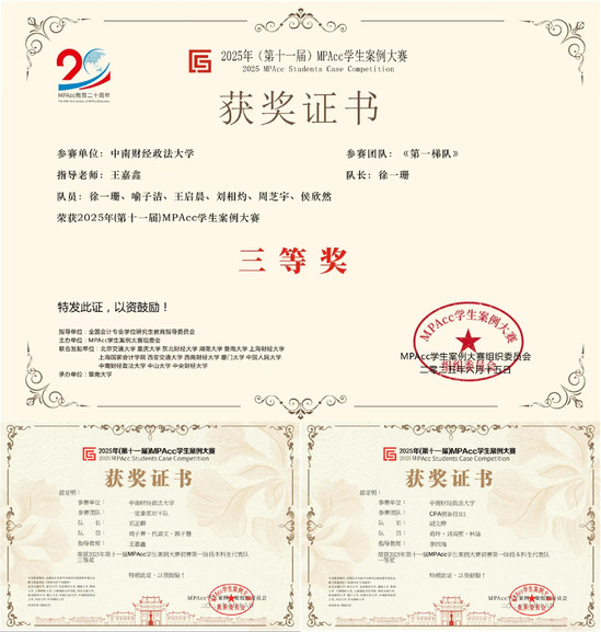 2025年6月15日,我国会计专业学位教育领域最具影响力的专业赛事——由全国会计专业学位研究生教育指导委员会指导,MPAcc学生案例大赛组委会主办的2025年(第十一届)中国MPAcc学生案例大赛在广州落下帷幕。我院学子凭借扎实的专业知识、出色的实践能力和团队协作精神,取得了优异成绩,为学院赢得了荣誉。其中,由王嘉鑫副教授指导的2024级会计专硕团队“第一梯队”荣获全国MPAcc代表队三等奖;由李四海教授指导的2023级本科生团队“CPA预备役101”荣获全国本科生代表队一等奖;王嘉鑫副教授指导的2022级本科生团队“一定拿奖对不队”荣获全国本科生代表队三等奖。